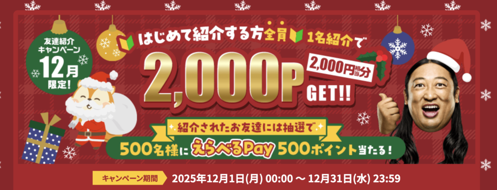 また、新規入会したあなた自身がお友達や家族にモッピーを紹介して初めてお友達紹介を行い、お友達が2026年1月末までに500P獲得すると2,000円分のボーナスポイントがもれなく貰えます。