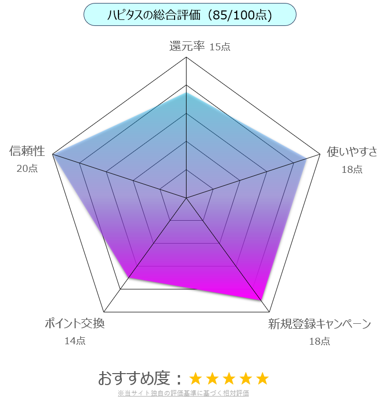 | ハピタス | ![]() | ★★★★★ | 高還元・初心者向け | 紹介リンク | - | ◯(詳細) | 1P=1円 | 300円〜 | 基本無料 | ポイント獲得から180日 | ◯ | ◎ (上場企業グループ) |