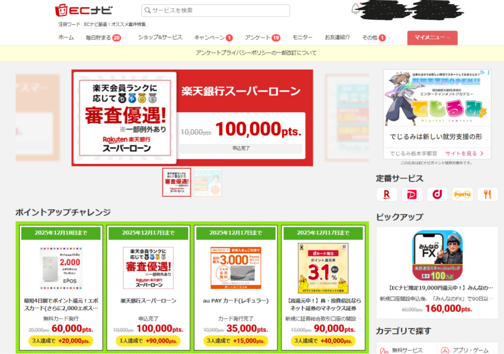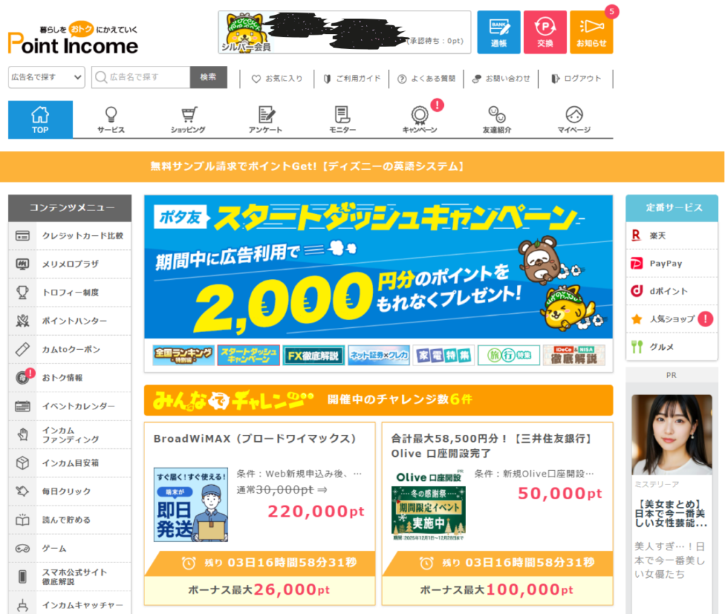 ログイン後は、広告一覧や新規登録特典の内容をすぐに確認できます。