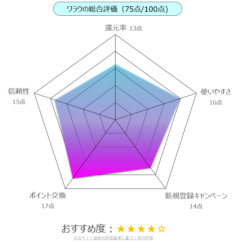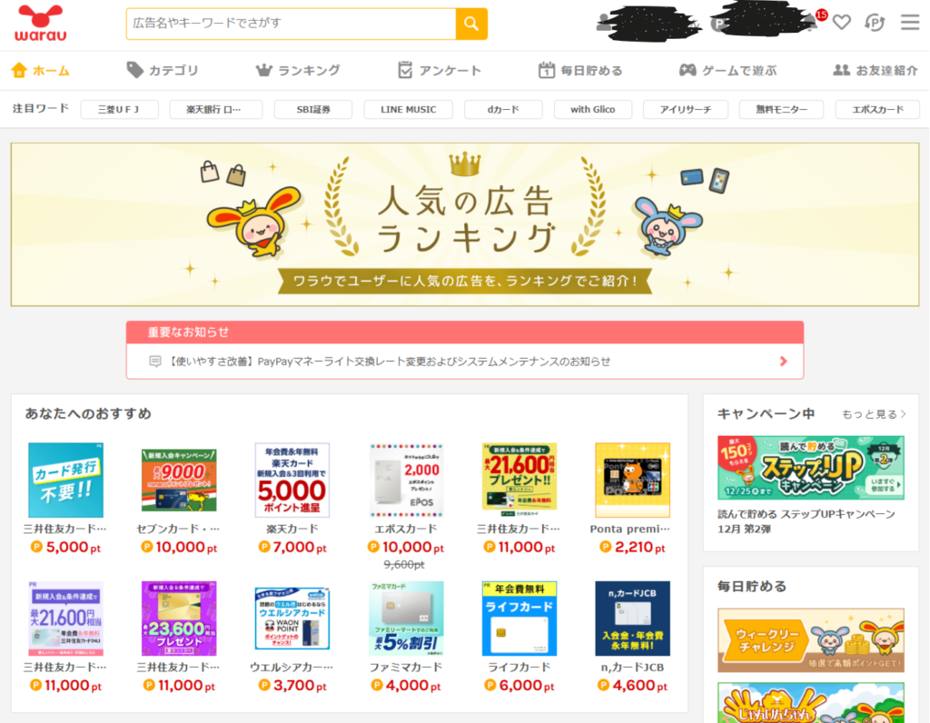 | ワラウ | ![]() | ★★★★☆ | UIが見やすく初心者向け | 紹介リンク | 6ab9 | ◯(詳細) | 1P=1円 | 300円〜 | 基本無料 | 最終ポイント獲得日から1年 | X | ◎ (老舗サイト) |
