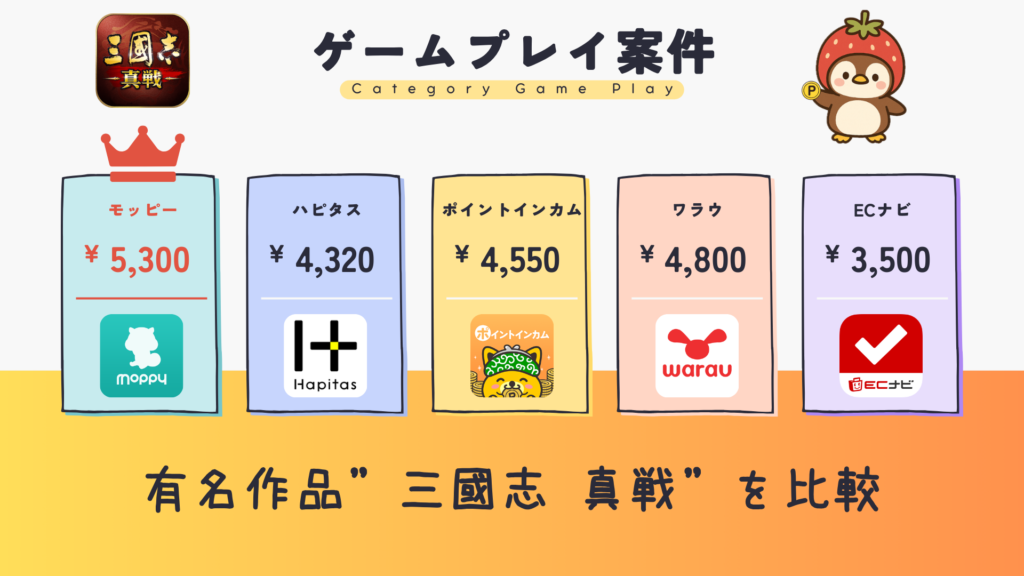 ここからは、実際に同じ案件をカテゴリー(クレカ作成/口座開設/会員登録/ゲーム)別にポイントサイトで比較した結果を見ていきます。